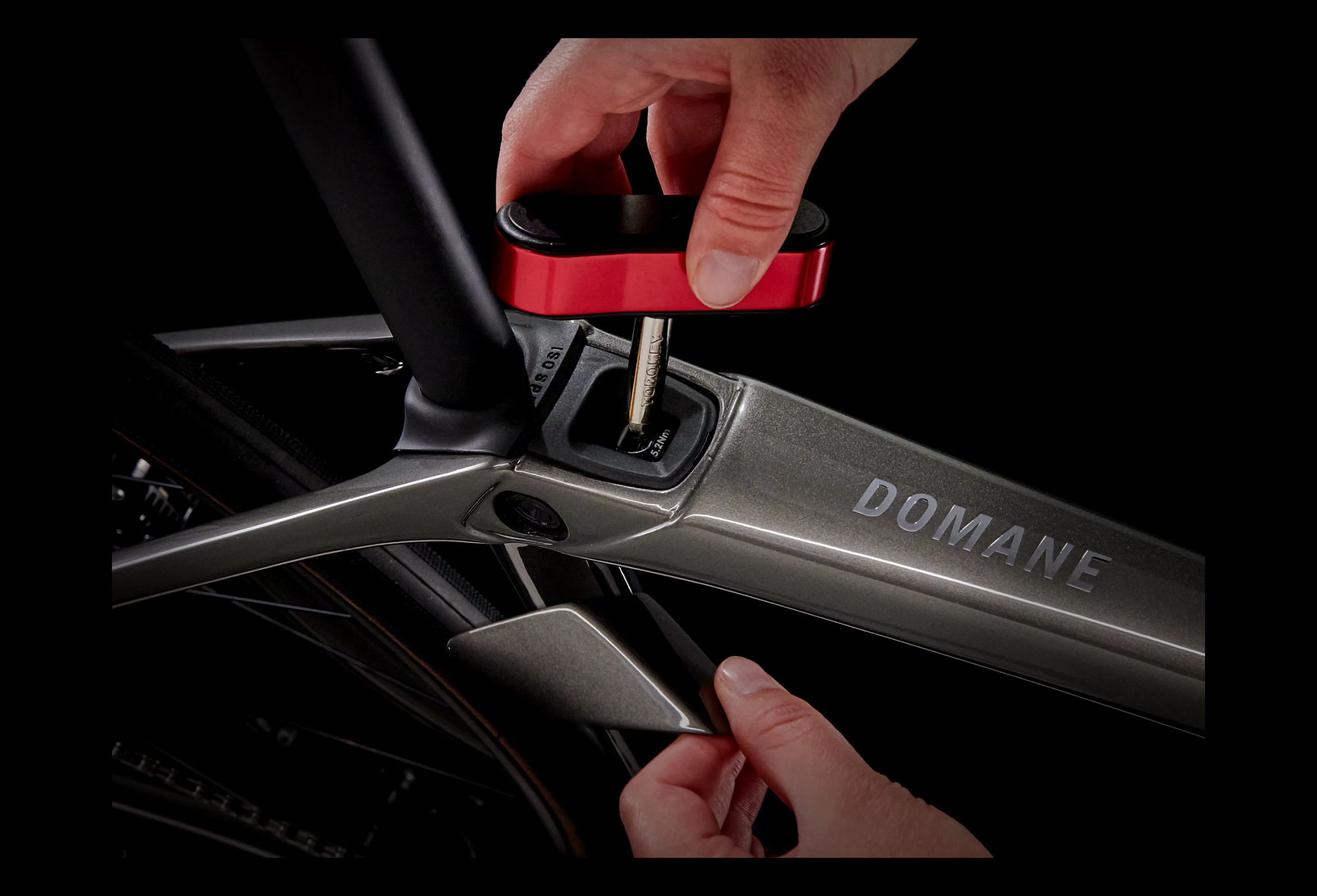 | Fourche | Domane SL carbone, pivot conique carbone, acheminement interne des câbles de frein, fixations pour garde-boue, freins à disque à fixation Flat-Mount, axe traversant 12×100 mm |