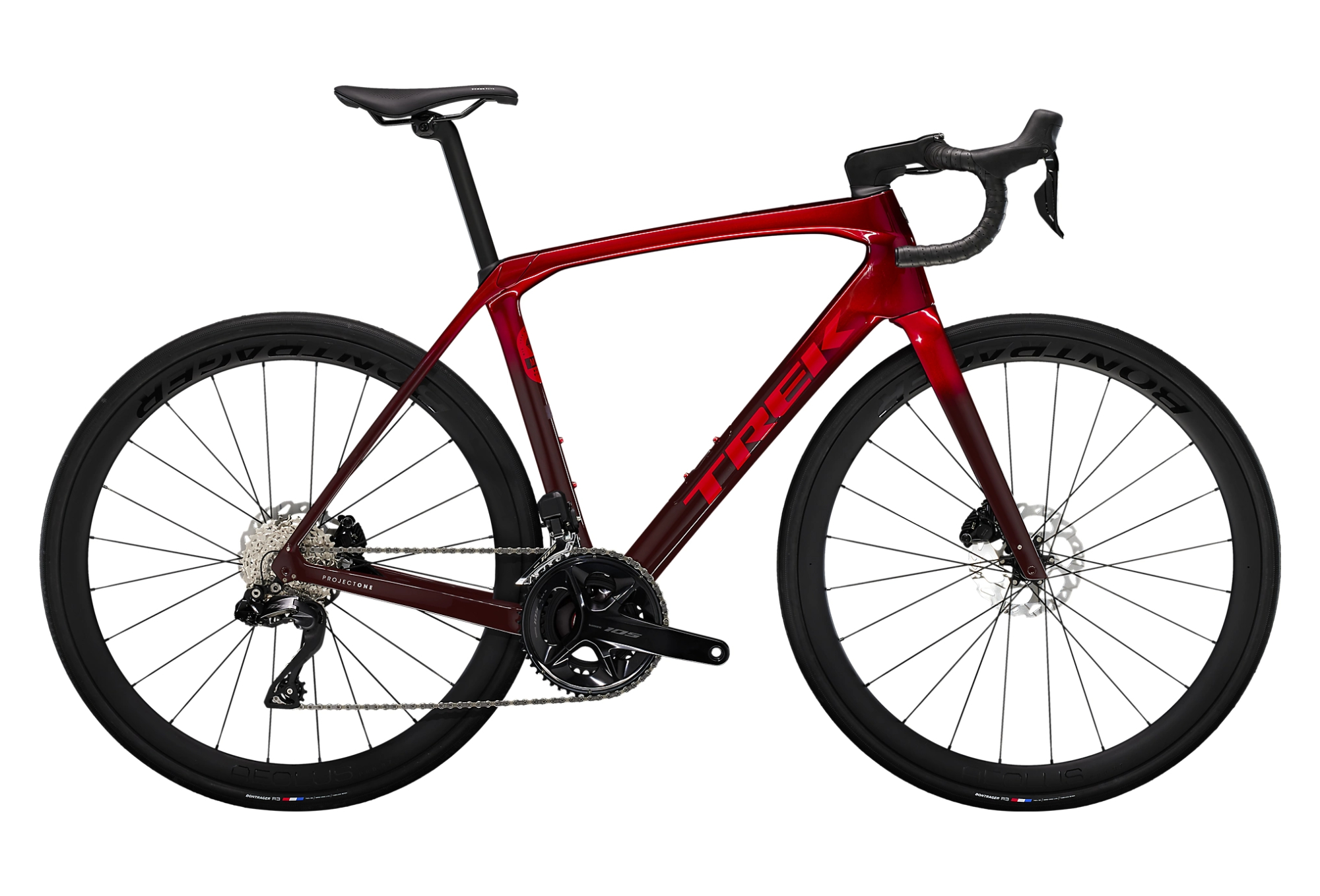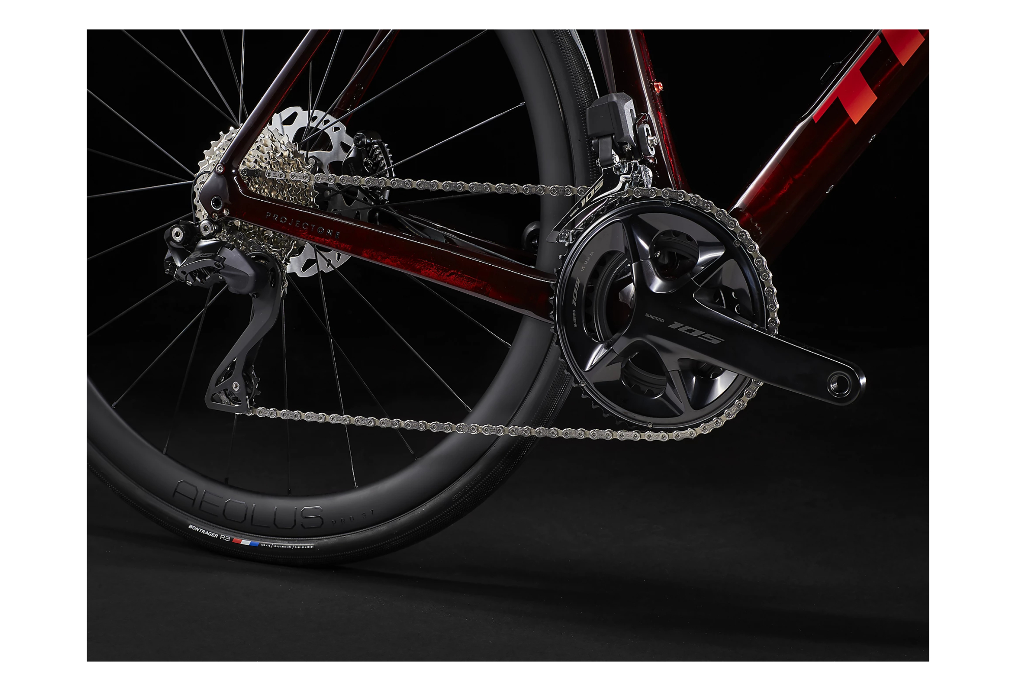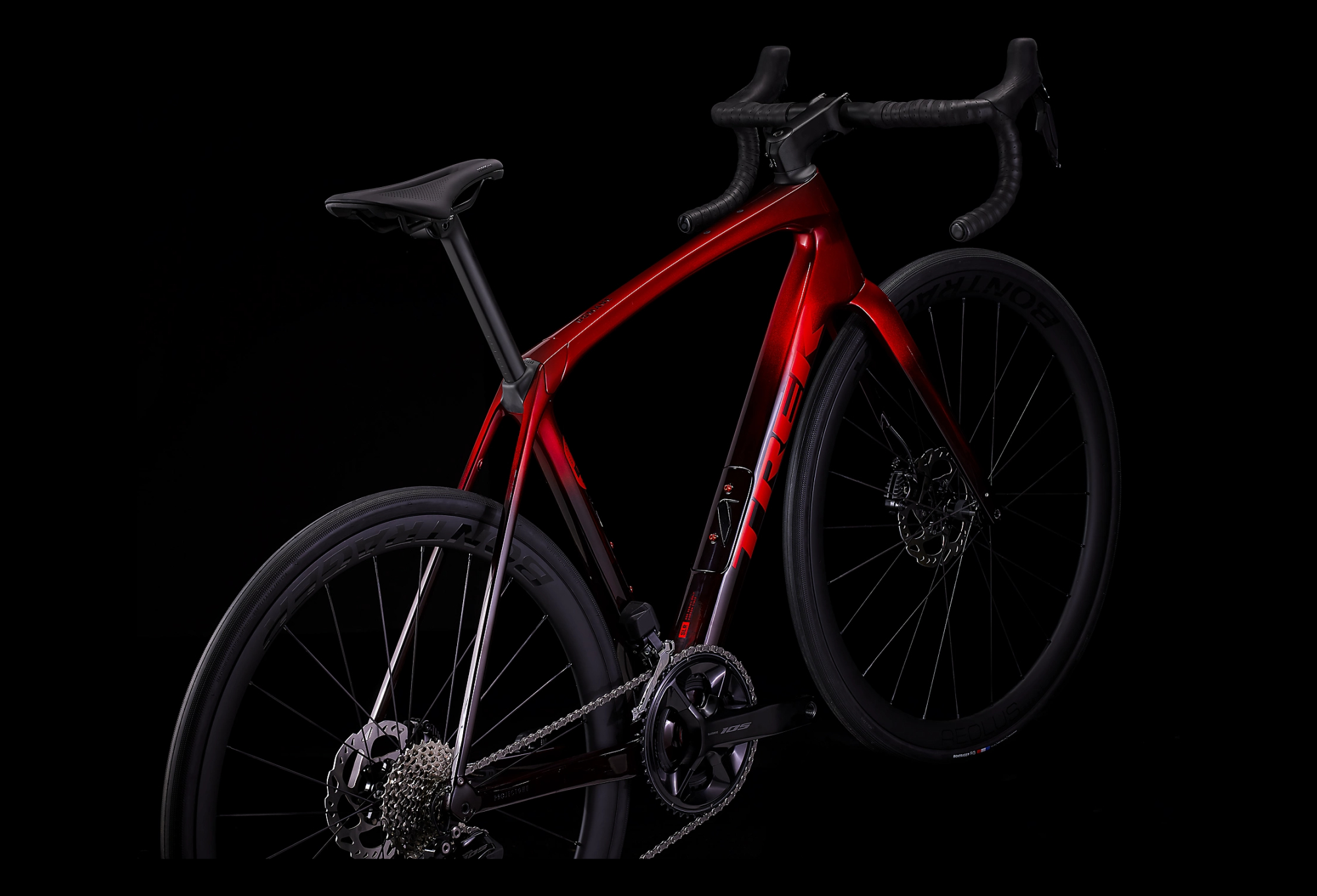 Il est équipé d’une transmission électronique sans fil 2×12 105 Di2 de Shimano, de puissants freins à disque à fixation Flat-Mount, de roues Aeolus Pro 37 en carbone et d’un cintre Bontrager Pro IsoCore qui garantit 20 % d’atténuation supplémentaires des vibrations par rapport à un cintre en carbone traditionnel.