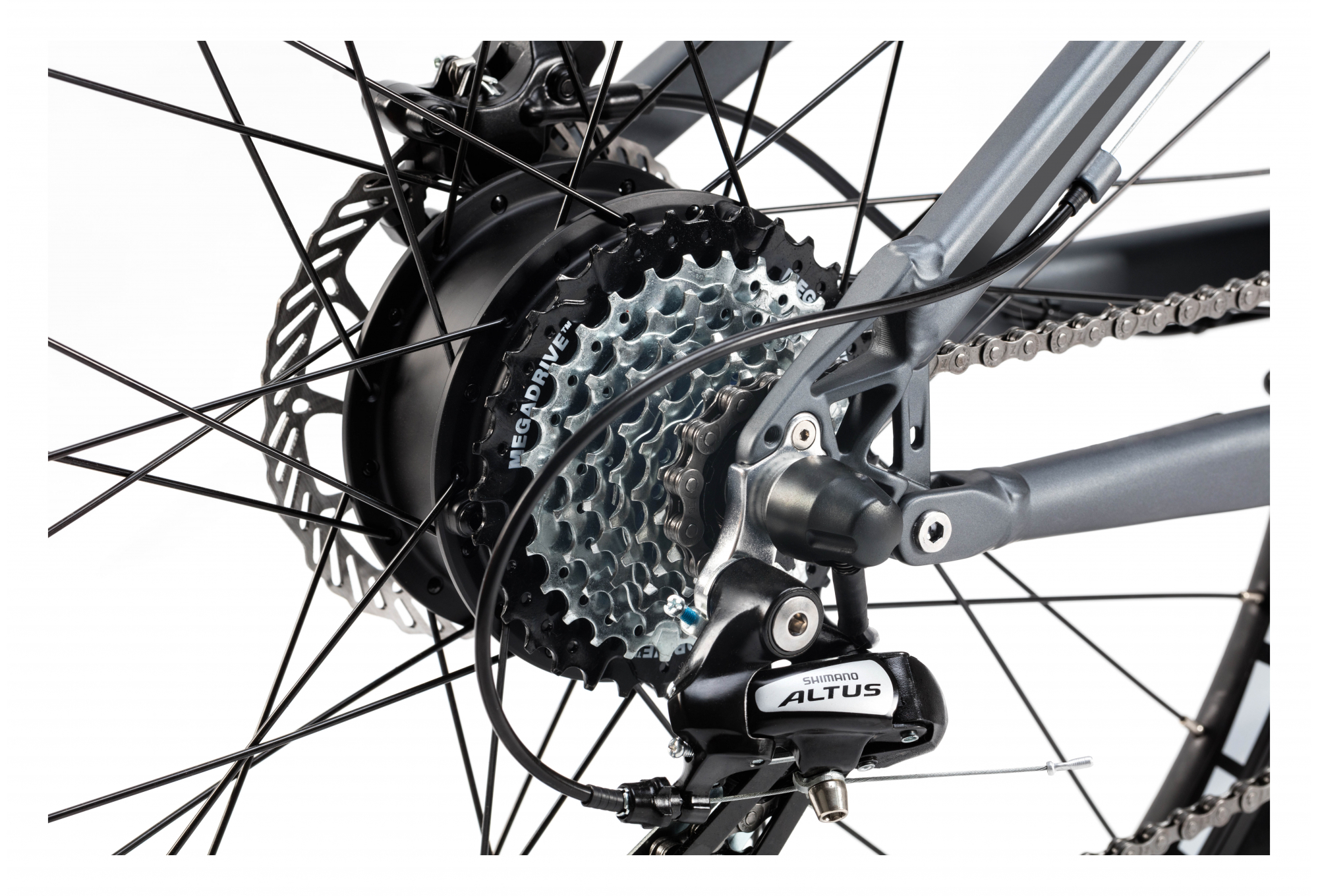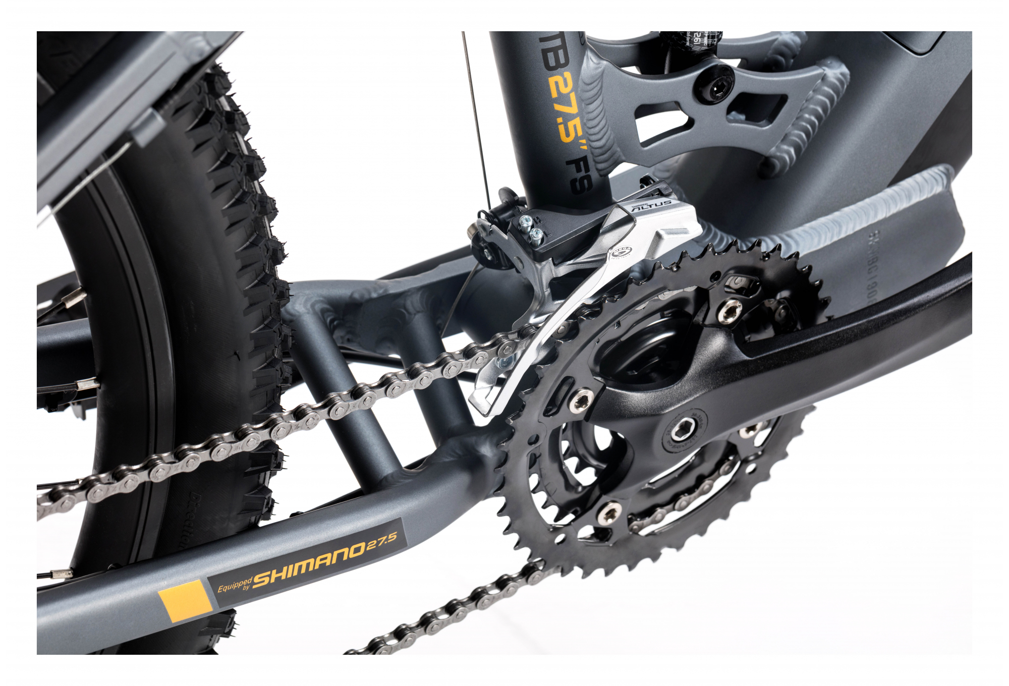 Un freinage – sec – ne pose aucun problème grâce à ses freins à disques hydrauliques avant et arrière, il est Full SHIMANO, ALTUS à 24 vitesses (modèle Shimano ALTUS RD-M310L). Son guidon oversize de 700 mm (plus épais au milieu) permet une conduite plus confortable et plus précise, soutenue par une fourche avant Suntour XCM à suspension hydraulique, avec blocage et débattement de 120 mm.