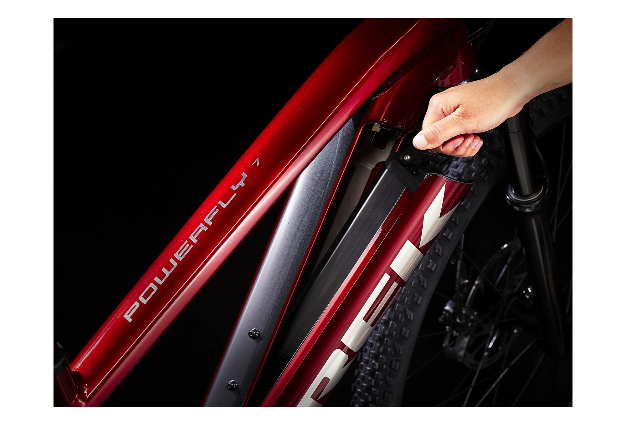 - Le système de batterie intégrée amovible de Trek affiche un look remarquable et est on ne peut plus convivial : il dissimule complètement la batterie dans le cadre afin de la protéger, il permet de retirer aisément la batterie sans outillage et laisse de l’espace pour la fixation d’un porte-bidon.