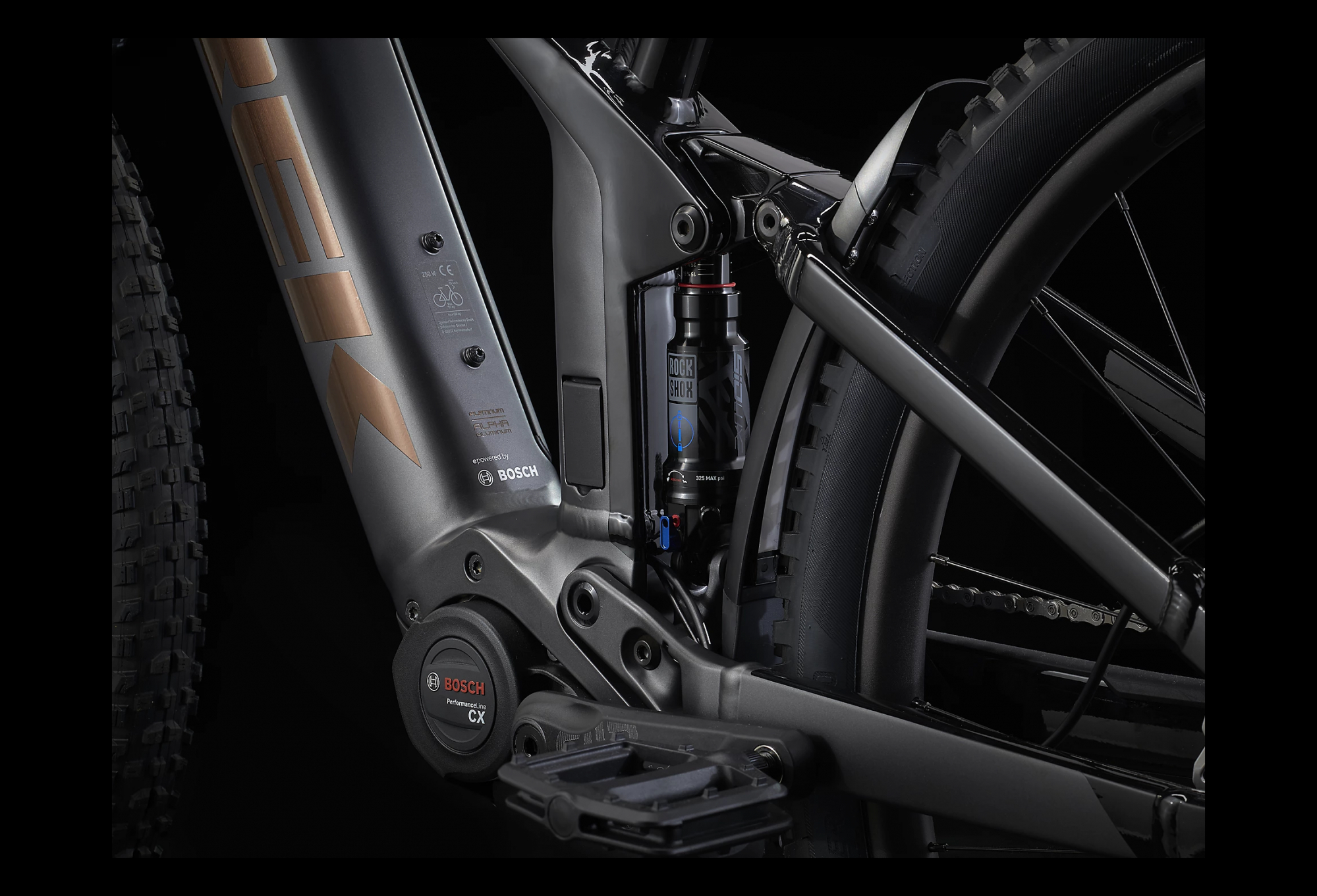 • Sur un VTT électrique, la suspension intégrale bouleverse la donne : elle absorbe les obstacles du terrain afin que vous puissiez exploiter le plein potentiel du système d’assistance au pédalage Bosch.