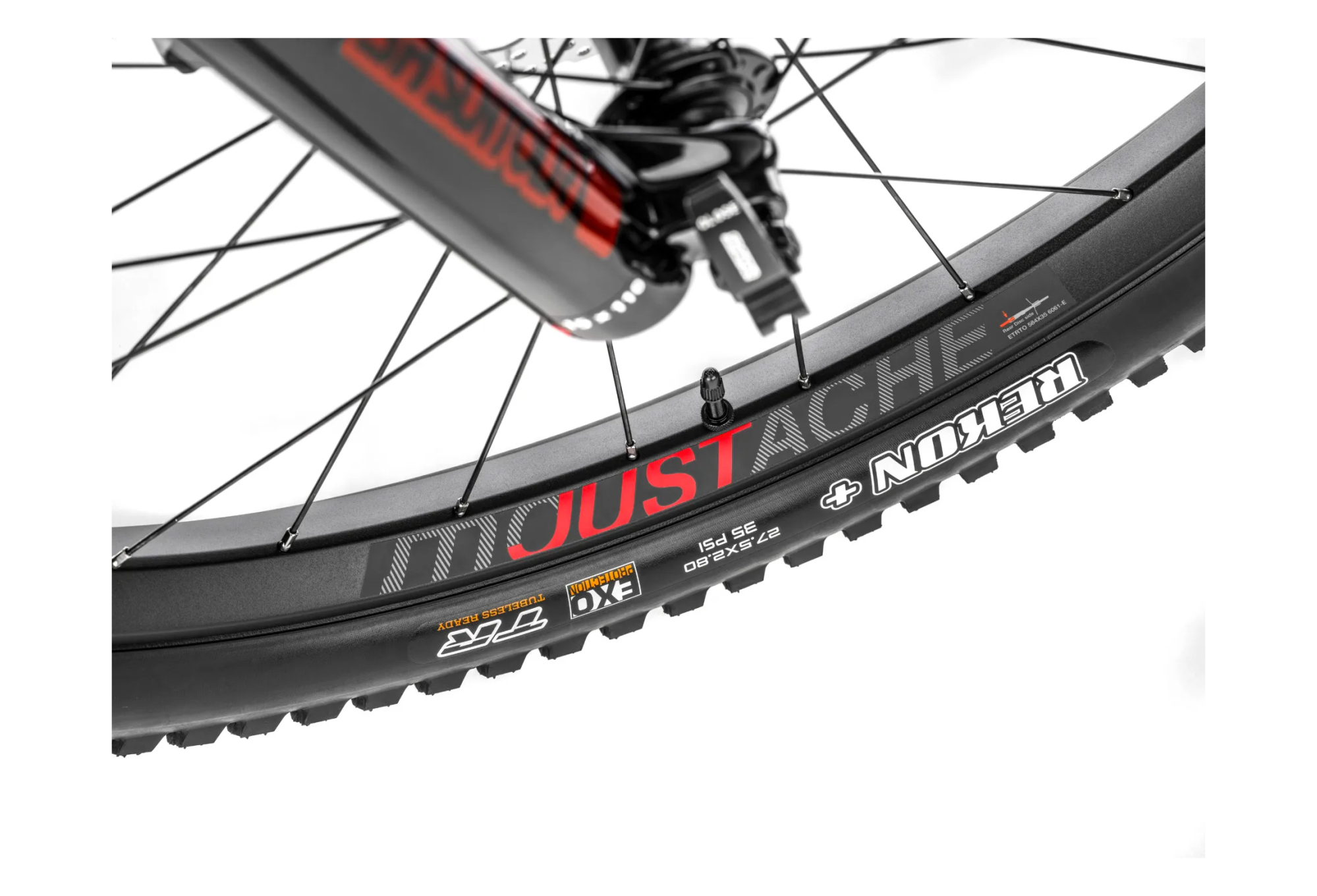 Jantes Moustache, asymétriques, aluminium 6061E, soudées, double paroi, 28 trous, 27.5″, largeur interne 35mm, montées avec valves et flap Tubeless