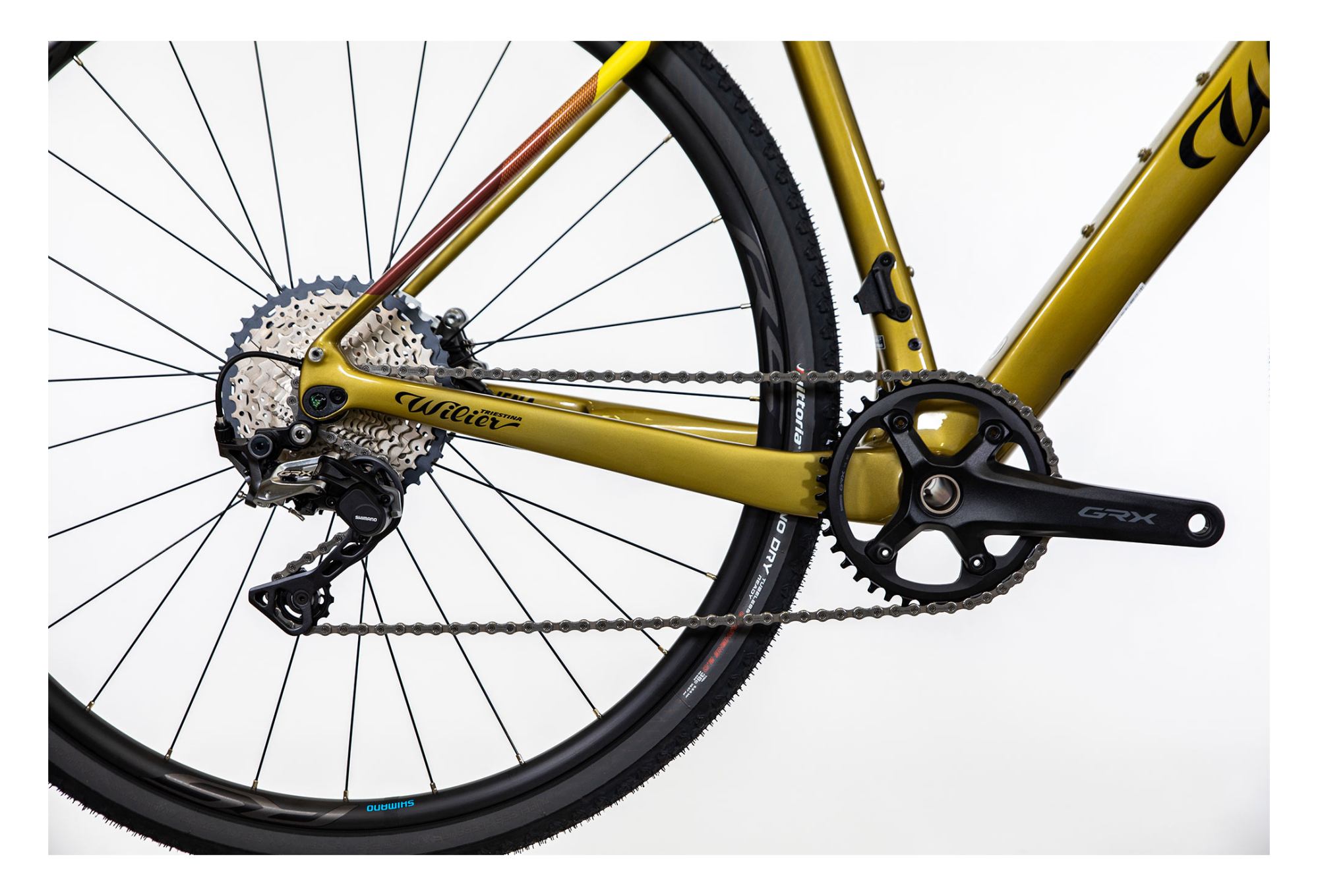 Wilier Triestina Jena ne connaît aucune limite d’utilisation et de configurations possibles. L’espace entre le cadre / fourche et les roues vous permettront de monter des pneus larges de 700 mm (28″) ou des roues MTB au diamètre 650B. Avec des roues de 700 mm (28″), il est possible d’utiliser des pneus jusqu’à 44 mm de largeur et avec des roues MTB 650B d’arriver à une largeur de 48 mm, égale à 1.95″ (testé sur pneu Vittoria).